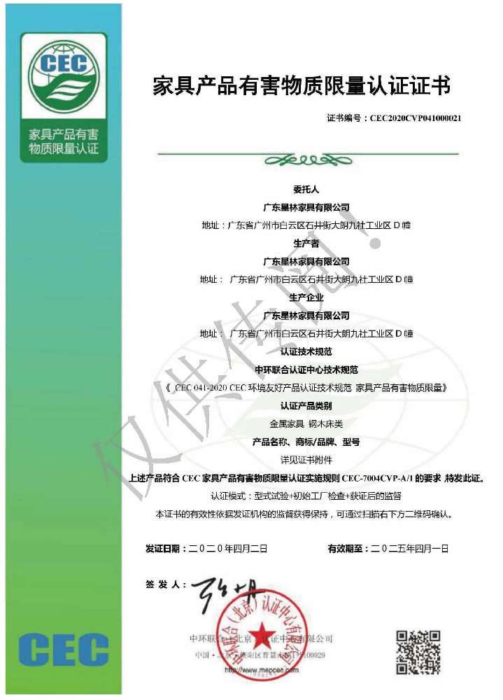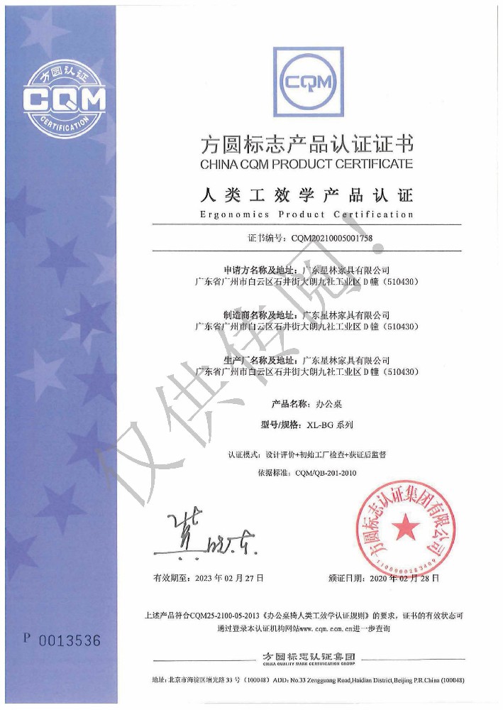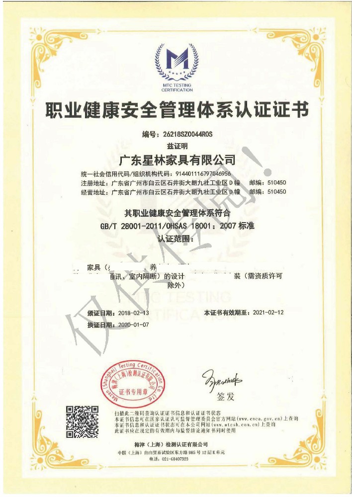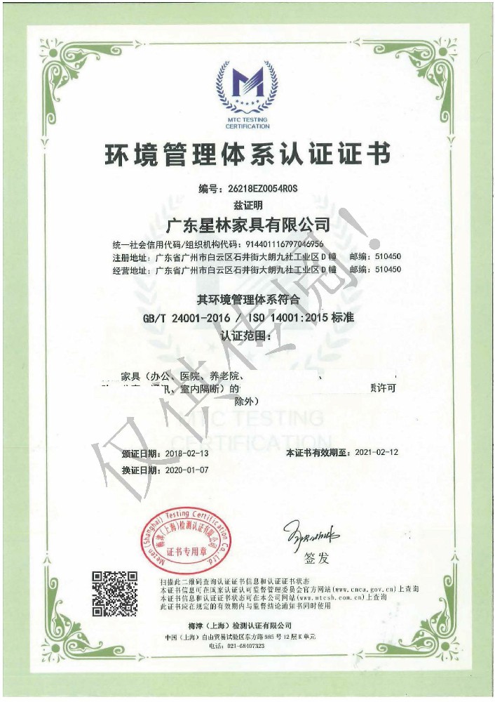 廣東星林家具有限公司創建于家具盛世之期,專業致力于辦公家具、醫療家具、養老家具的開發、設計、生產。公司率先通過ISO9001質量管理體系認證和ISO14001環境管理體系認證及職業健康安全管理體系認證,從而獲得了中環聯合(北京)認證中心有限公司頒發的“中國環境標志產品認證證書(十環認證)”等。